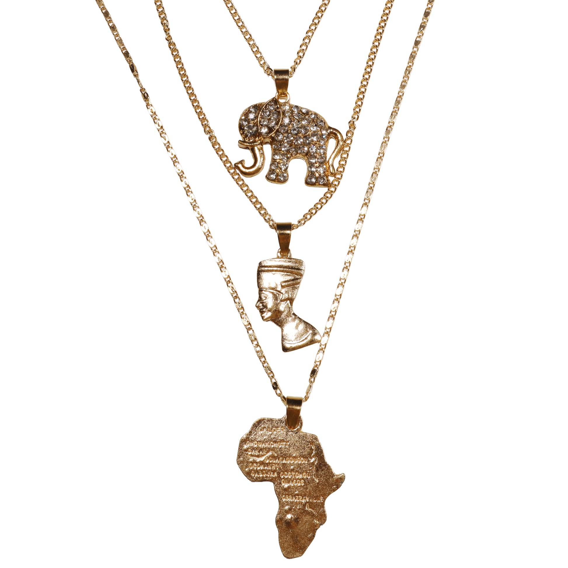 Adjustable strap gold necklace with queen, Africa and elephant charms